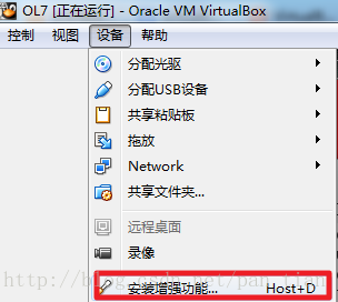 有的人反应只要设置双向粘贴就可以,但是我的不行,我还需要再给虚拟机安装一下增强功能。需要启动虚拟机,安装菜单项“设备”中的最后一项。